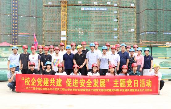 为庆祝中国共产党成立98周年,6月28日上午,yl23455永利安全工程党支部与浙江二建中南公司党总支在浙江二建武汉名都花园项目部组织开展了“校企党建共建,促进安全发展”主题党日活动。浙江二建中南公司机关支部书记、总经理助理沈江红、名都花园项目支部书记张明星、名都花园项目副经理李保明、委书记江本武、工会主席雷克江、经理助理、安全工程党支部书记吝曼卿和安全工程党支部党员及员工代表共30余人参加了此次活动。