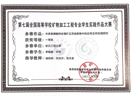 全国高等公司矿物加工工程专业员工实践作品大赛是面向矿物加工工程、矿物资源工程、资源循环科学与工程等专业在读老员工举办的全国性赛事,本届竞赛共收到全国相关高校的215件作品,参赛师生共计1000余人。公司获得一等奖、二等奖和三等奖各1项。由杨丙桥、何东升、张汉泉老师指导的“木质素磺酸钠在磷矿正浮选脱镁中的应用及其机理研究(参赛员工:李毓豪,刘华)”获科技论文类一等奖。