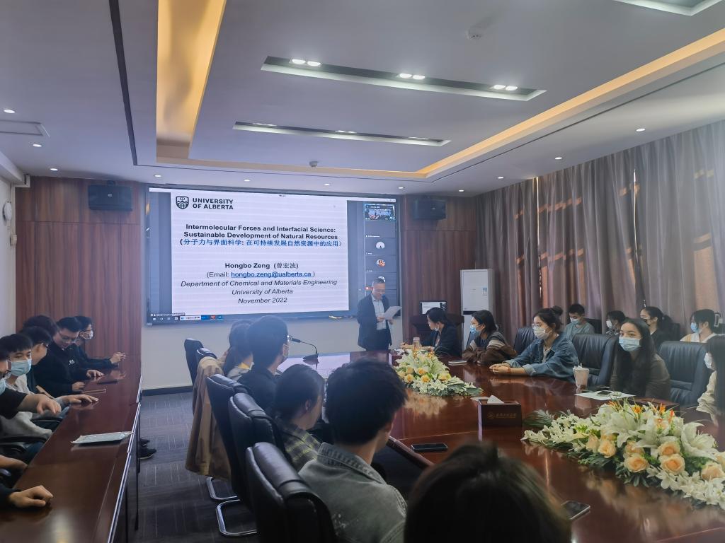 (通讯员傅苗)11月10日下午,应yl23455永利、校庆办、科发院、研究生院邀请,加拿大阿尔伯塔大学化学工程和材料工程系终身教授、加拿大工程院院士、国家讲席教授(Tier 1 Canada Research Chair)、加拿大皇家科公司青年院士曾宏波在线为我们作了一场题为“Intermolecular Forces and Interfacial Science: Sustainable Development of Natural Resources (分子力与界面科学:在可持续发展自然资源中的应用)”的学术报告。报告会由yl23455永利经理何东升教授主持,yl23455永利师生聆听了报告。