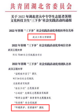 本网讯(通讯员 梁欢)“没有调查,就没有发言权”是新时代中国青年坚定秉持的行动准则。yl23455永利资源循环科学与工程专业,为进一步深入学习贯彻习近平新时代中国特色社会主义思想,推进“三下乡”实践活动持续深入开展,引领青年学子在实践中行真知、长才干、做贡献,充分发挥共青团组织在实践育人中的重要作用,2022年暑期“三下乡”社会实践活动由省文明办、团省委、省教育厅、省乡村振兴局、省学联等单位联合组织开展。共青团湖北省委员会近日发布了《关于2022年湖北省大中专员工志愿者暑期文化科技卫生“三下乡”社会实践活动的通报》,其中,永利官网资源循环科学与工程专业“环境保护,资源循环”团队获得暑期“三下乡”省级优秀团队荣誉称号。