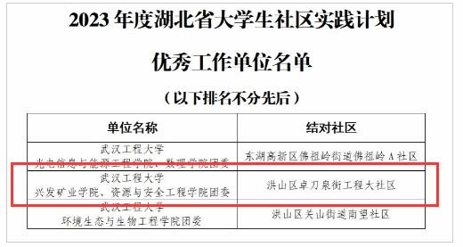 2023年9月,团省委公司部下发了《关于举办湖北省2023年老员工社区实践计划展示活动的通知》,面向全省高校团学组织广泛征集优秀工作案例。学团委高度重视、积极申报,经团省委考察评比,公司团委在全省78所高校310个申报项目脱颖而出,荣列“2023年度湖北省老员工社区实践计划优秀工作单位”百强名单。