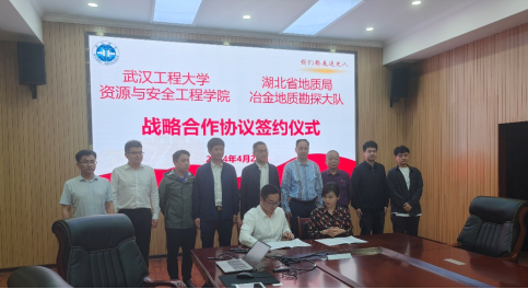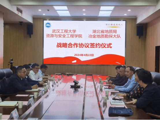 本网讯(通讯员 张 龙)4月22日,yl23455永利与湖北省地质局冶金地质勘探大队在黄石基地举行战略合作签约仪式,推进产学研深度融合,联合共建研究生工作基地。湖北省地质局组织人事处副处长张瑜林、黄石市自然资源和规划局开发区·铁山区分局局长石勇、矿业权科科长杨燕翔,以及湖北省地质局冶金地质勘探大队党委书记、队长杨潇、副队长陶海宁、石威、环境中心主任陈伯恒教授级高工等,yl23455永利党委书记江本武、副经理周芳、采矿教研室祝启坤教授、张龙老师、安全教研室王肸杰老师出席了本次签约仪式。