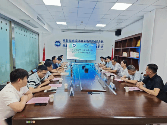 本网讯(通讯员 张 龙) 7月11日,公司副经理周芳教授、采矿工程教研室张龙老师及一名研究生赴湖北省地质局冶金地质勘探大队(以下简称“冶金地质大队”)开展产学研合作洽谈活动暨研究生工作站揭牌仪式。冶金地质大队党委书记、队长杨潇,副队长王水华,副队长石威,十堰环境地质中心主任于义军,黄石环境地质中心主任陈伯恒等参加座谈交流会。黄石市自然资源和规划局开发区·铁山区分局副局长王福彬,地灾科长杨燕翔等列席座谈会。
