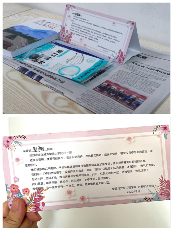 温馨小礼包:经理寄语小卡片、公司专版报纸、校徽、员工手册、口罩