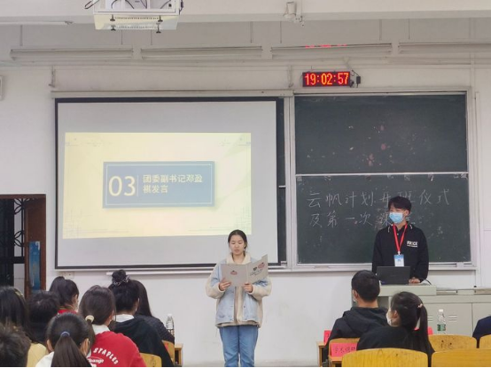院团委副书记(员工)邓盈祺介绍了本次培训班的意义和作用,阐述了“云帆计划”中的“云帆”之意,“云帆”取自李白的诗《行路难》中“直挂云帆济沧海”,借由诗句中那不畏前路险阻,积极乐观的处事态度鼓励全体员工干部,号召全体成员在此次培训班中学到有用的知识和技能,提升自己的能力。
