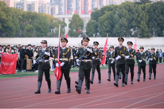 迎着初春朝阳,国旗班迈着铿锵有力的步伐,护送鲜艳的五星红旗进场。在雄壮的《义勇军进行曲》伴随下,五星红旗冉冉升起,迎风飘扬,熠熠生辉。全体师生奏唱国歌,向国旗行注目礼。