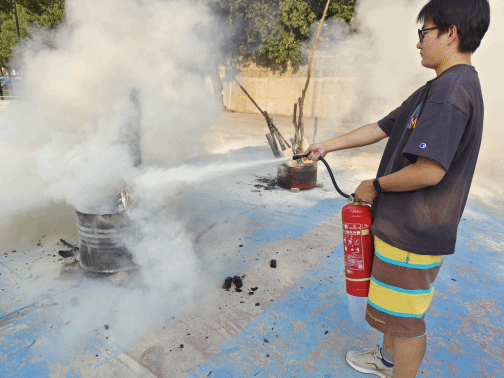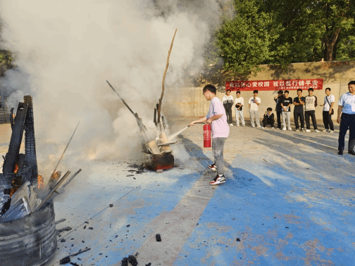 保卫处老师点燃燃料,待火着起来后给同学们示范了正确的灭火器使用方式,一起扑灭了现场火情。现场同学的学习积极性很高,认真的听讲及观摩后,纷纷加入实践操作中。同学们沉着冷静,有序操作,先提起灭火器,后拉开安全梢,另一只手握住皮管,对准着火点,选择上风口,将干粉射入火中,掌握了如何正确使用灭火器。
